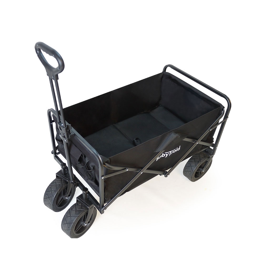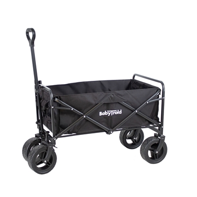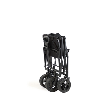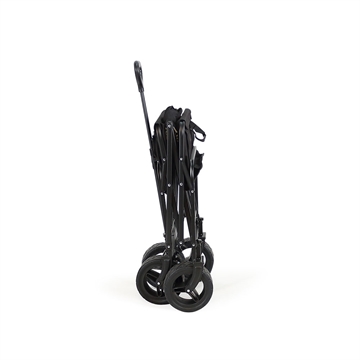 Trækvognen er udstyret med justerbart håndtag og bremse på forhjulene for ekstra sikkerhed. Stoffet dækker stellet og sikrer både et pænt udtryk og praktisk brug. Når vognen ikke er i brug, foldes den let sammen og fylder minimalt.
