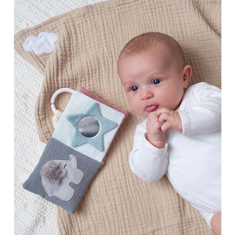 Bogen er udelukkende lavet af tekstil med flere sjove funktioner til de mindste. Din lille kan se sig selv i spejlet eller lave en fløjtende lyd med en af ​​de sjove figurer. Der er også figurer, der rasler. En blød og spændende stofbog, perfekt som dit barns første bog. Bogen opmuntrer til udvikling af barnets forskellige sanser, stimulerende med lyde, billeder og farver. En meget elsket bog for små børn. Bogen er også udstyret med en plastik clips, så den kan sættes fast på eksempelvis barnevognen, så den er nem at have med på tur.
