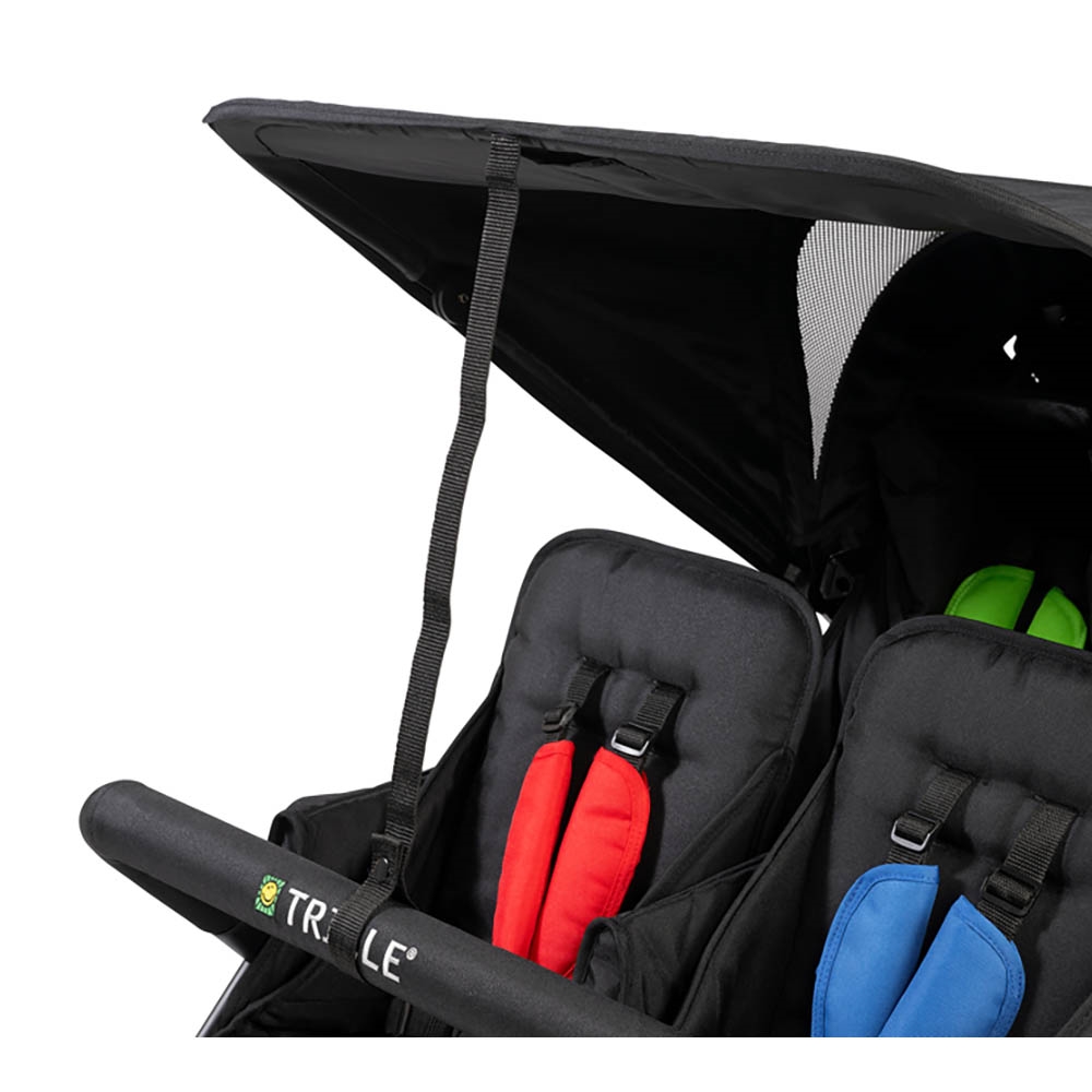 TRILLE Quadro er en fantastisk institutions klapvogn med 4 siddepladser, med 4 forskellige farver på selerne, så hvert barn kan have sin helt egen plads. Hvert sæde er testet op til 15 kg og hele vognen er testet iht. EN1888-1:2018+A1:2022.